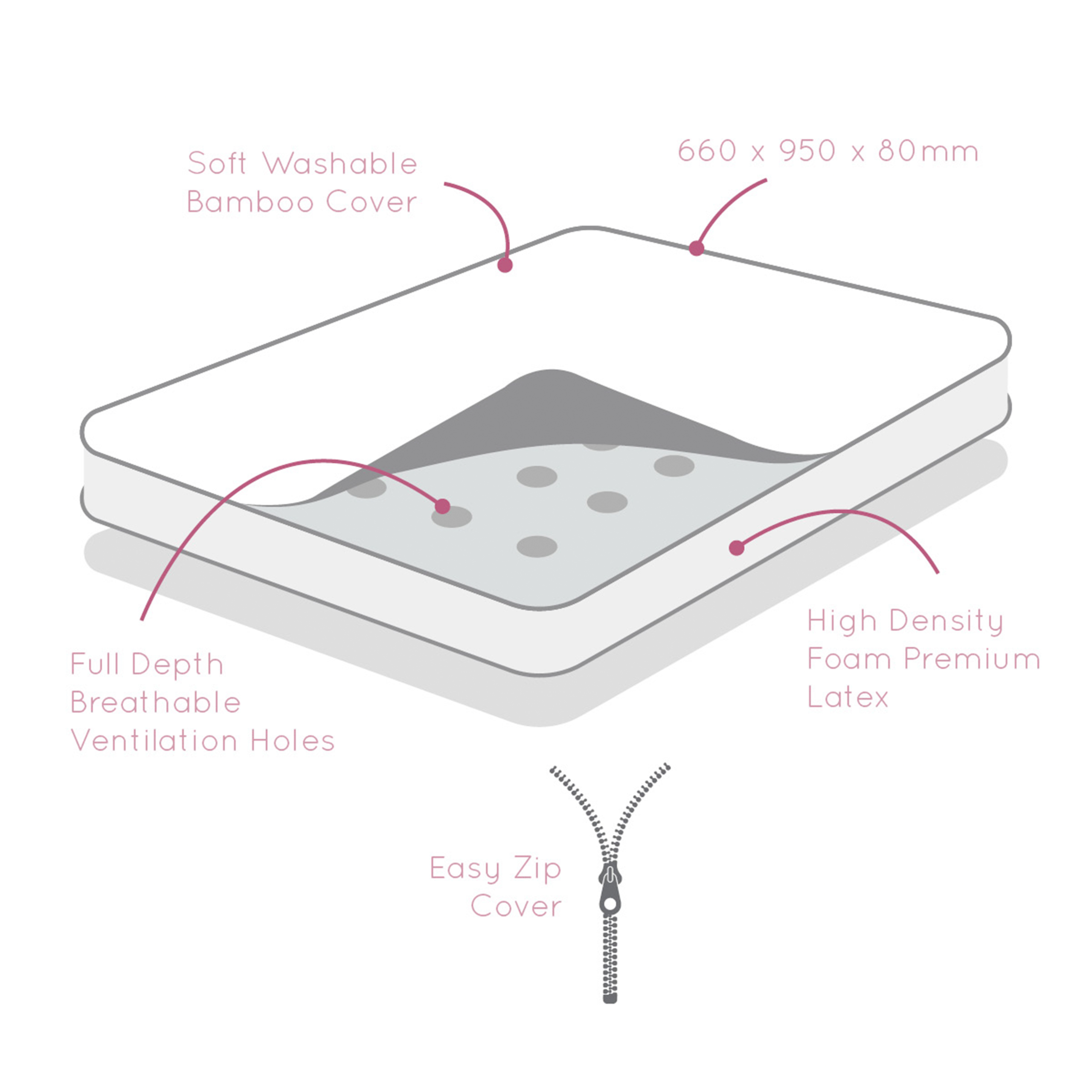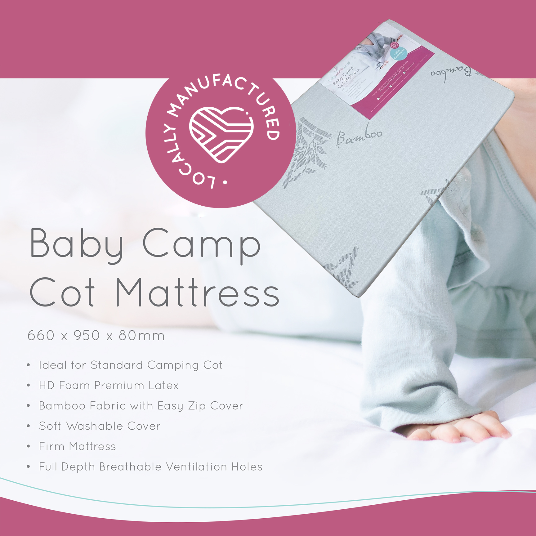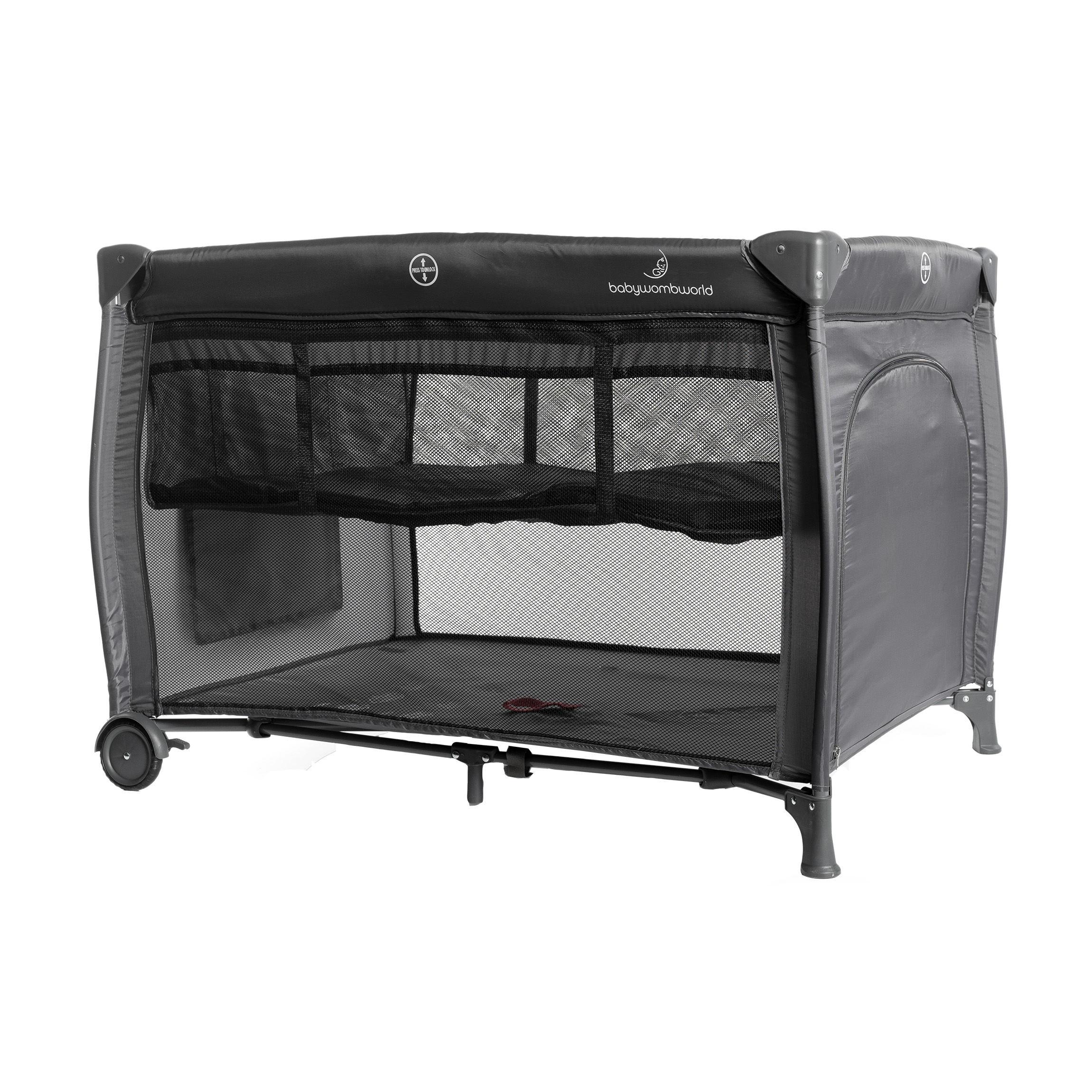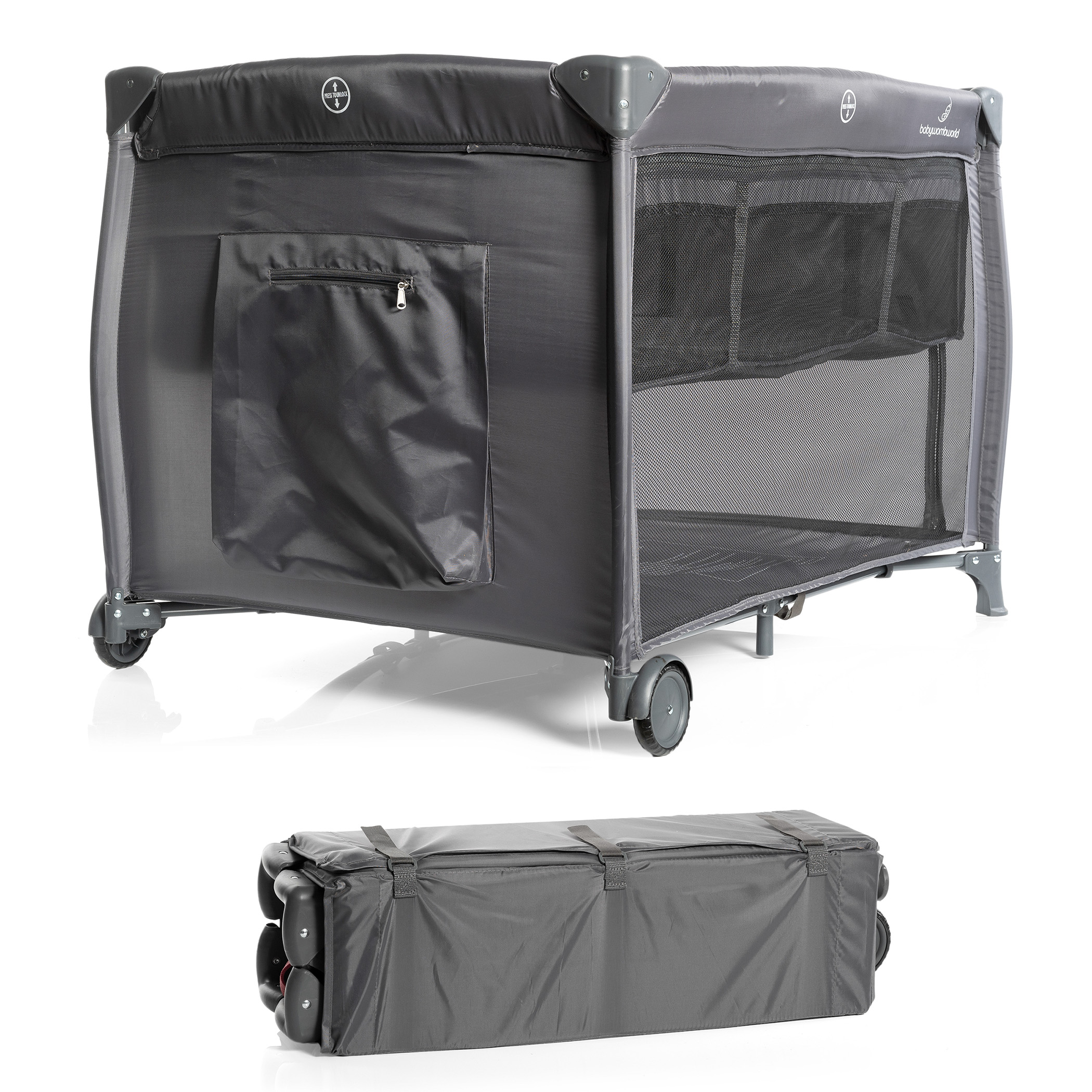 Get the Standard Camp Cot (Dark Grey) together with the Premium Latex Baby Bamboo Mattress for safe, comfortable sleep. Cot size: 660mm x 950mm x 80mm. Perfect for newborns and toddlers, with breathable bamboo fabric and a sturdy, travel-friendly design.